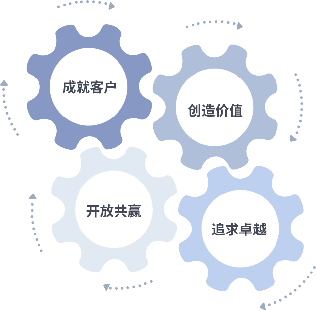 成就客户是一切决策的出发点,,创造价值是衡量所有工作的标准,,追求卓越是我们做事做人的态度,,开放共赢是我们的格局也是最终的结果。。。。价值观的齿轮环环相扣,,推动着组织里的每个人不断向前。。。