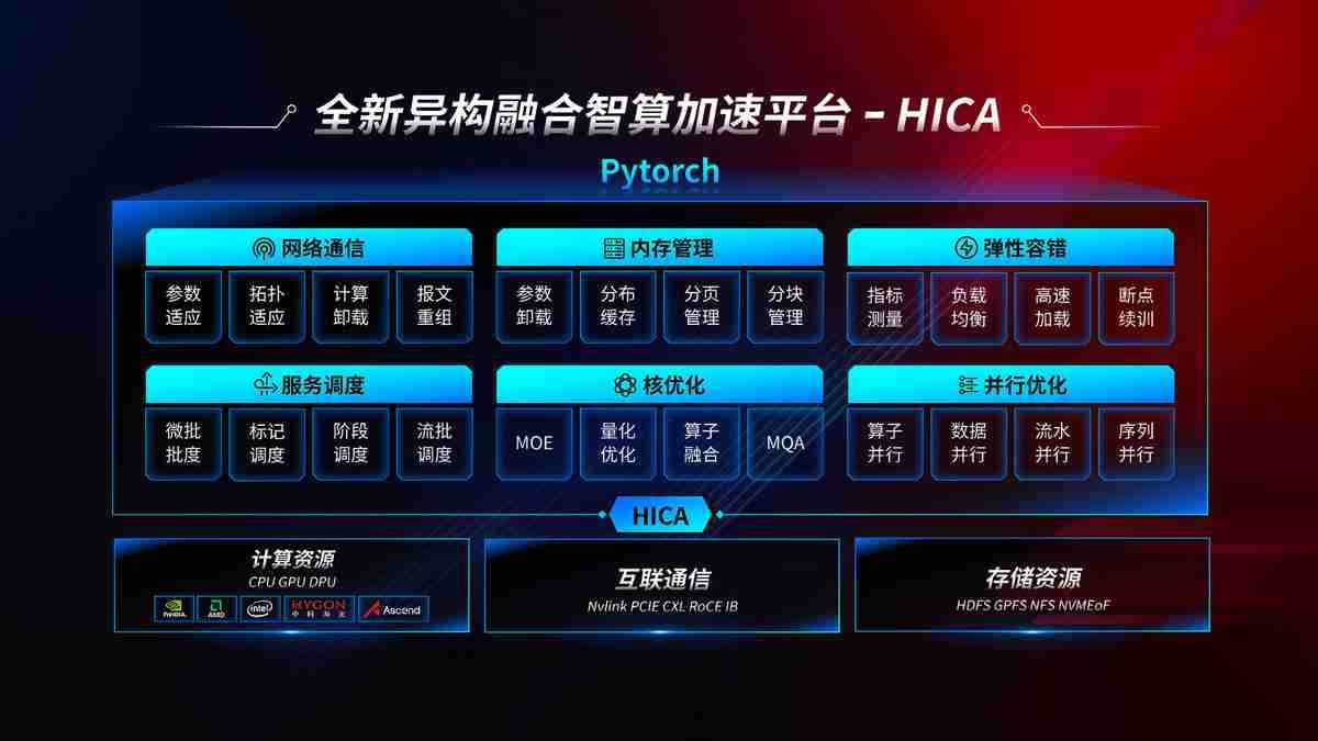 通过自研的服务层、、、中间适配层、、、、以及调度编排算法,,,,采用数据并行、、模型并行等多种并行方式,,,把并行计算任务进行有效的分解,,使其分别由相应的软件栈和算力资源来承接。。。。当GPU资源变化,,,,HICA可以实时动态调度计算子任务并调整模型拓扑和架构,,,,以充分聚合各种算力资源。。。。