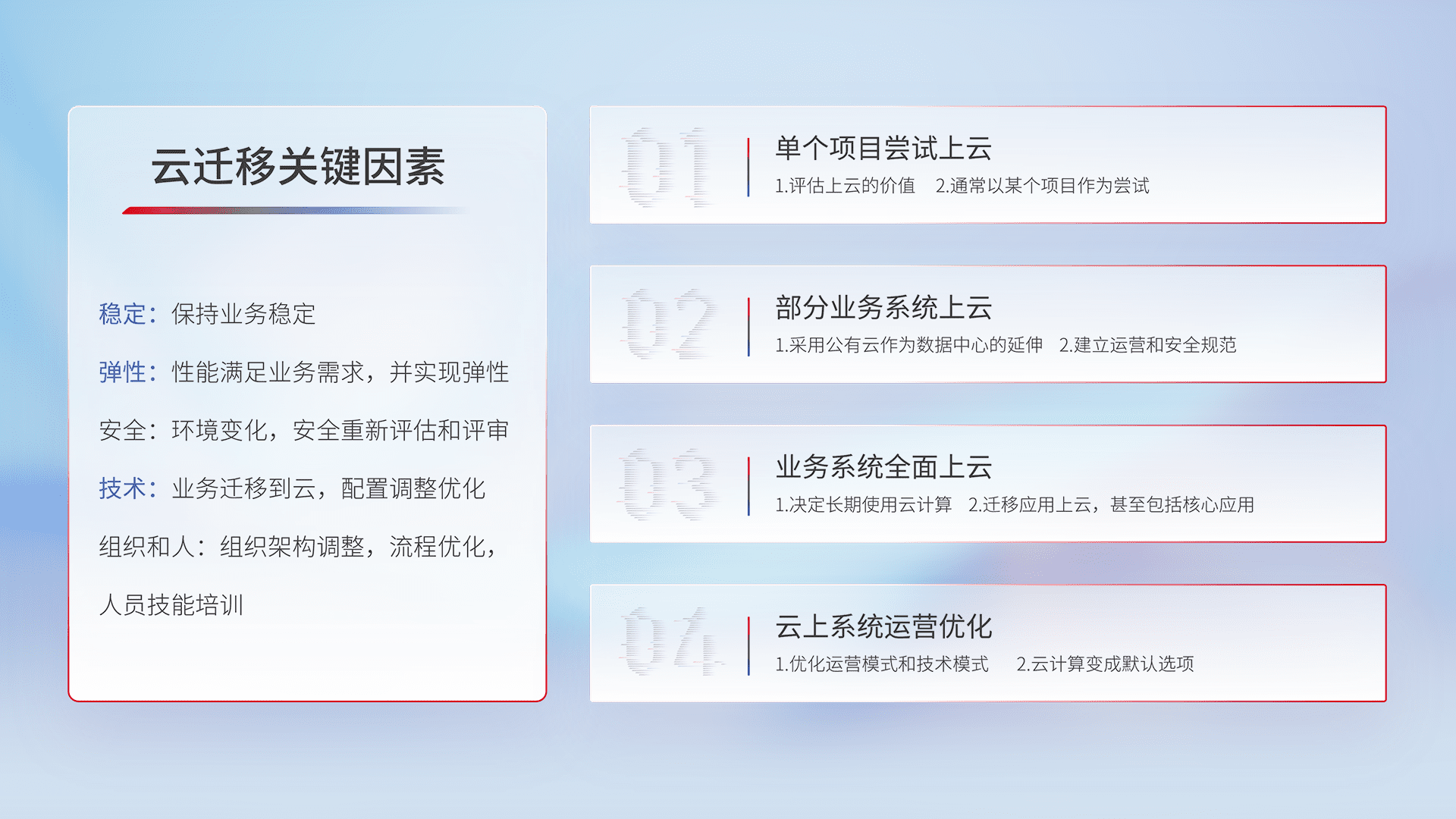 结合实际业务,,从规划设计、、、、云平台选型、、、、云原生改造、、、数据迁移、、、、集成交付,,,迁移全过程为客户识别最佳上云路径,,做好风险识别管理,,,,设计网络架构、、、、身份权限、、、安全审计合规、、、操作审计、、日志审计、、监控告警策略、、、、多站点容灾设计等,,,,对云上基础设施进行整体规划,,,,提升IT治理水平,,以满足弹性、、、高可用、、、高性能的需求。。。