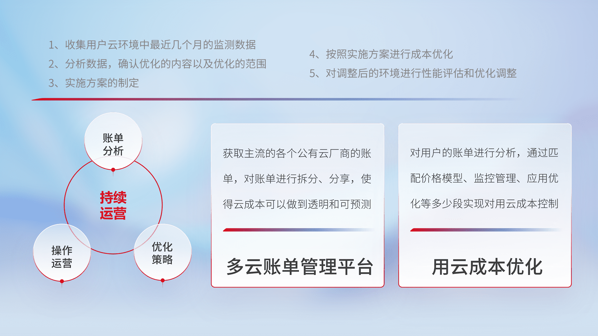 通过多云纳管,,,,以统一的资源数据模型把客户的云资源进行抽象和封装,,进而实现对多云资源的统一操作,,,,保障云资源管理的可靠性、、稳定性与可用性。。量身定制化运维内容,,,配置、、开发运维、、补丁管理、、、备份、、、监控、、、、认证和访问管理、、、审计和日常巡检等,,,保障在用云过程中的可靠度,,稳定度以及高可用率。。。。