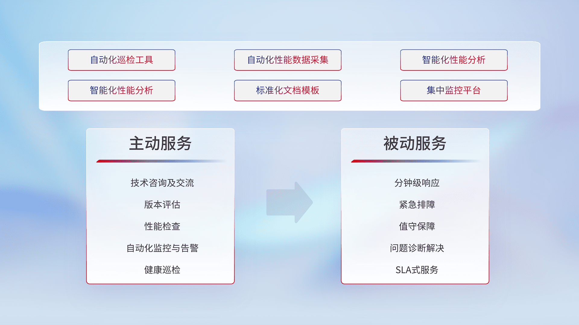 智能化工具和标准化文档,,,保障服务质量,,,,提供主动服务(包含技术咨询、、、、版本评估、、性能检查、、自动化监控与告警、、、健康巡检)和被动服务包含(分钟级响应、、、紧急排障、、、、值守保障、、、、问题诊断解决、、、SLA服务)。。